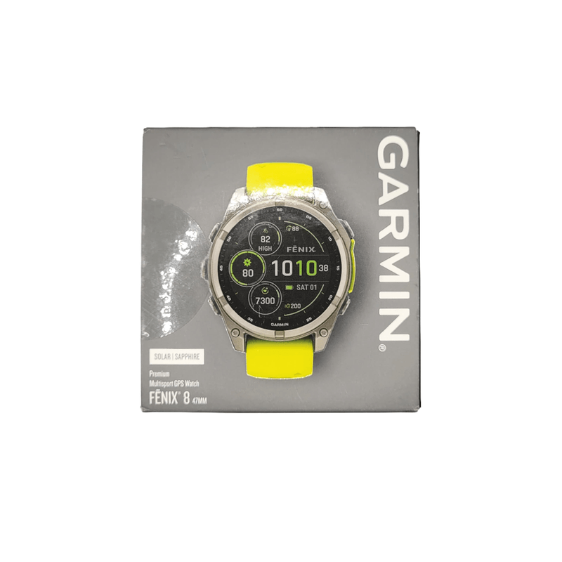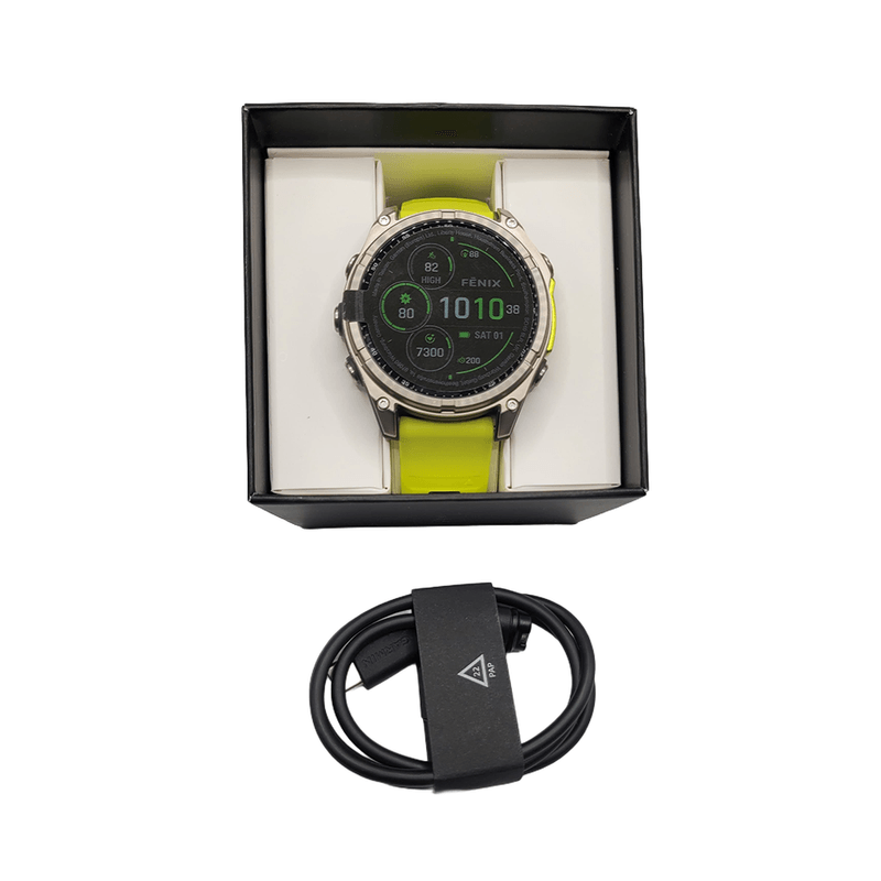 Outlet Relógio Garmin Fenix 8 Safira Solar Titânio com pulseira de silicone amarelo/grafite